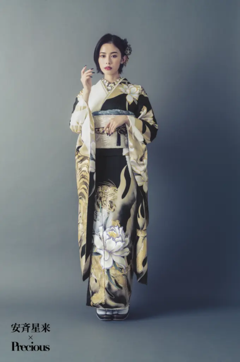 黒振袖は輪郭・姿勢・瞳・肌のコントラストを強調するため、