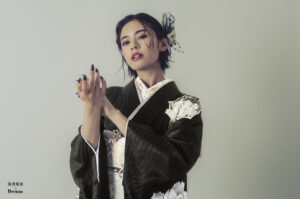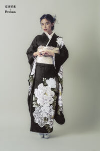 女優の安斉星来さんモデルの振袖 黒色振袖に大柄の白花柄