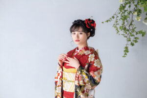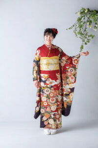 赤で美しく染めたシルク地に刺繍を施した職人技を詰め込んだ振袖です!