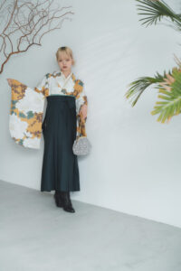 木々や空の色が振袖の色柄を引き立てる