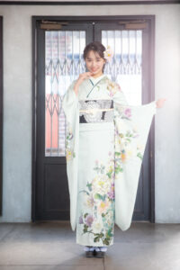 ご本人は最初、白地の振袖に惹かれていて、「写真で明るく見えるから白がいい」と思っていました。実際、白は人気色でもあり、トレンドとしても選びやすい色です。